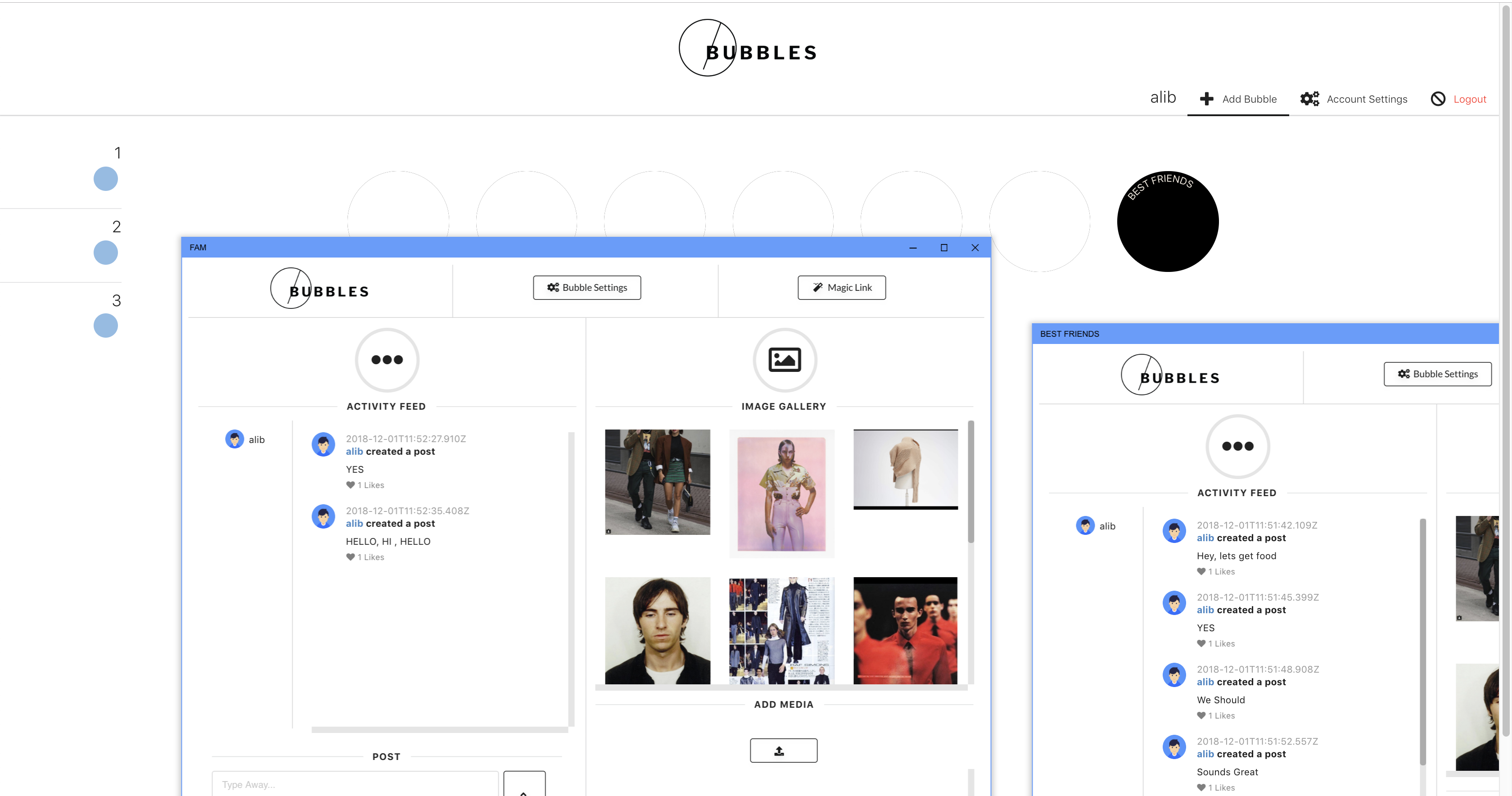 o Within each bubble, a user can participate in a group chat and feed, where they can share images, URLs, and videos for all members to view.