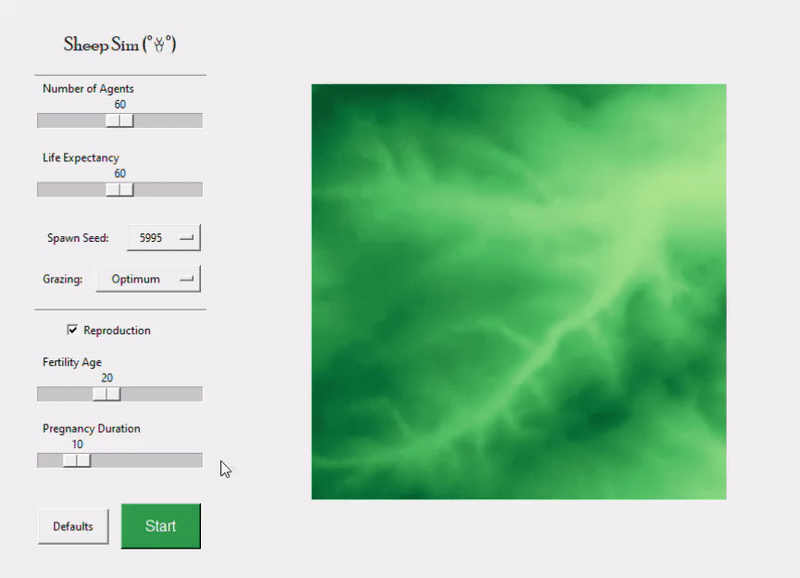 - Sexes and Reproduction - female sheep (white) can be impregnated by male sheep (black) if both sheep have sufficient store (default 50), are close enough (default within 20), and are of fertility age (adjustable in GUI, default 20)