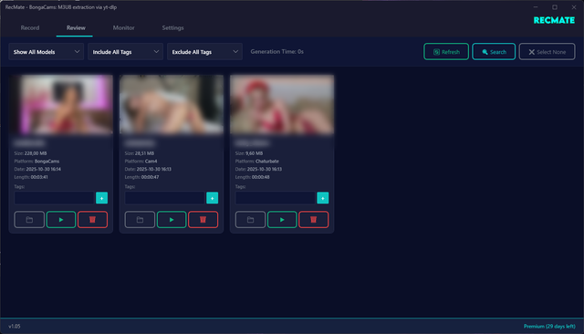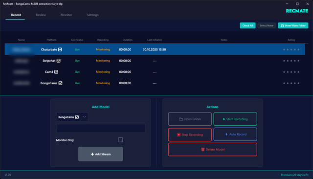 Add models, select platforms, enable auto-recording, or start/stop manually—all from one clean dashboard.