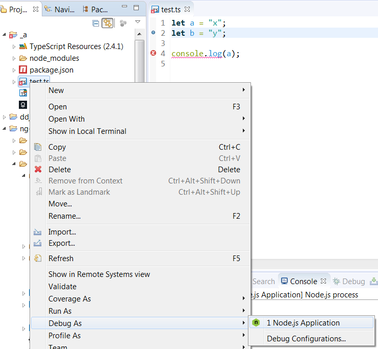 If you use Eclipse JEE Oxygen, you can run/debug TypeScript with Eclipse JEE Oxygen if *.js.map SourceMap files is generated.