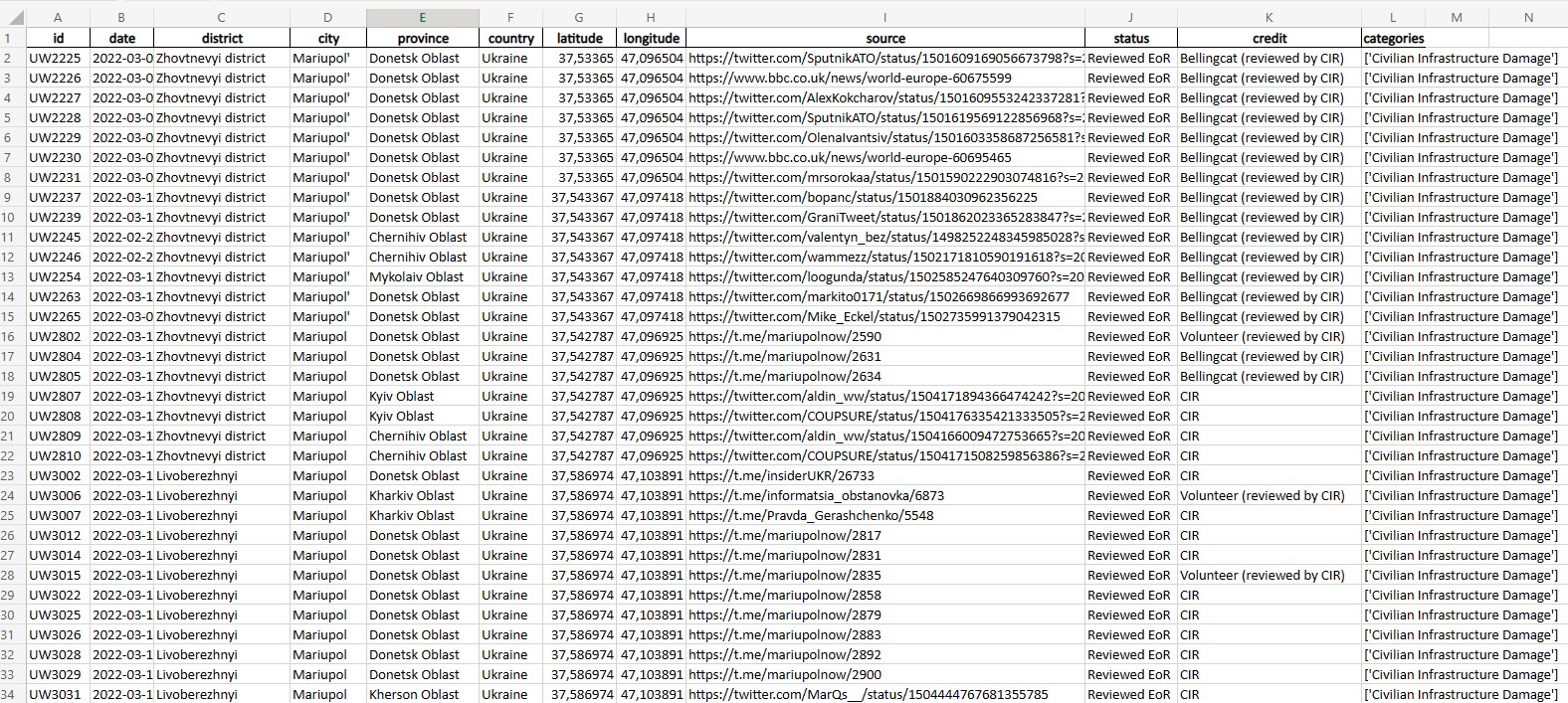 This Python script collects the events that have been added to the Russia-Ukraine Monitor Map made by Centre for Information Resilience (CIR), Bellingcat, Conflict Intelligence Team and the wider open source community, and it produces an output as local JSON or Excel files. Aditionally, you could automatically store the data in your own Google Spreadsheet account.