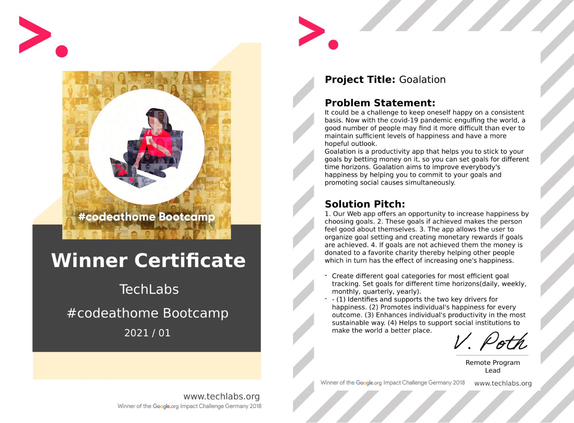 Goalation is a productivity app helps you to stick to your goals by betting money on it. If you miss your target, the money will be donated to a social purpose of your choice.