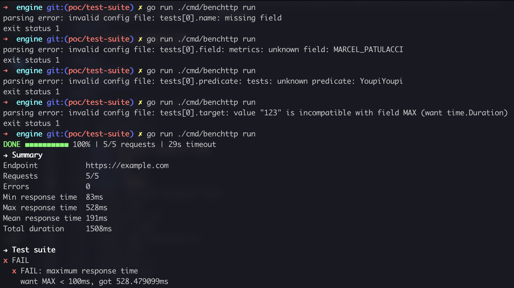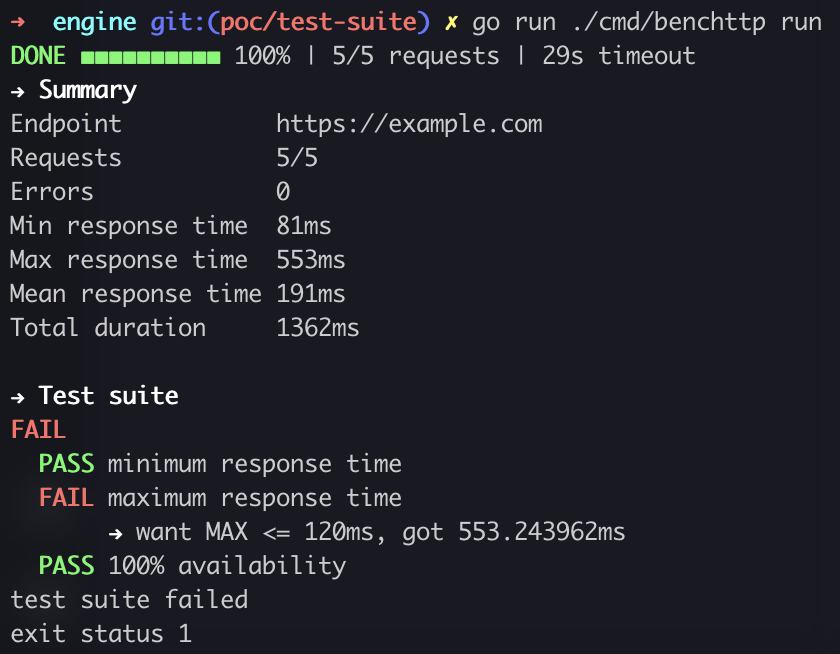 { "request": { "url": "https://example.com" }, "runner": { "requests": 5, "concurrency": 1 }, "tests": [ { "name": "minimum response time", "field": "MIN", "predicate": "GT", "target": "80ms" }, { "name": "maximum response time", "field": "MAX", "predicate": "LTE", "target": "120ms" }, { "name": "100% availability", "field": "FAILURE_COUNT", "predicate": "EQ", "target": "0" }, ] }{ "Metrics": {}, "Metadata": {}, "Tests": { "Pass": false, "Results": [ { "Input": { "Name": "minimum response time", "Field": "MIN", "Predicate": "GT", "Target": 80000000 }, "Pass": true, "Summary": "want MIN > 80ms, got 83.392463ms" }, { "Input": { "Name": "maximum response time", "Field": "MAX", "Predicate": "LTE", "Target": 120000000 }, "Pass": false, "Summary": "want MAX <= 120ms, got 433.415742ms" }, { "Input": { "Name": "100% availability", "Field": "FAILURE_COUNT", "Predicate": "EQ", "Target": 0 }, "Pass": true, "Summary": "want FAILURE_COUNT == 0, got 0" } ] } }Demo
