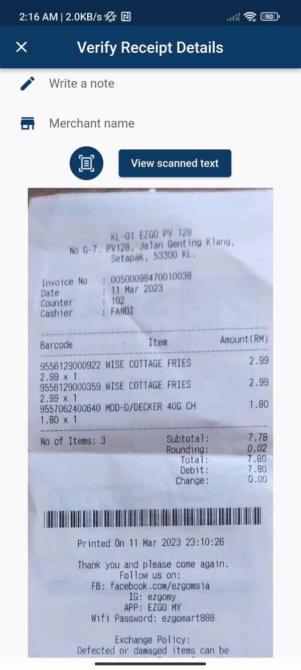 - Receipt scanning: Scan receipts to keep a digital record of your expenses.