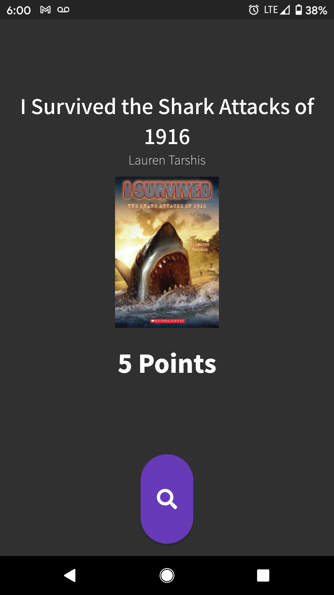 This app is designed to save time for student and teacher alike. To retrieve the number of Reading Counts points that might be associated with a book, you only need to launch this app, tap the big purple button, and scan the barcode on the back of the book. The app will do all of the "heavy lifting" of using the ISBN to find the author, doing an author search on the Reading Counts site, and returning the points value back to the app or showing zero if the title isn't found in the Reading Counts database.