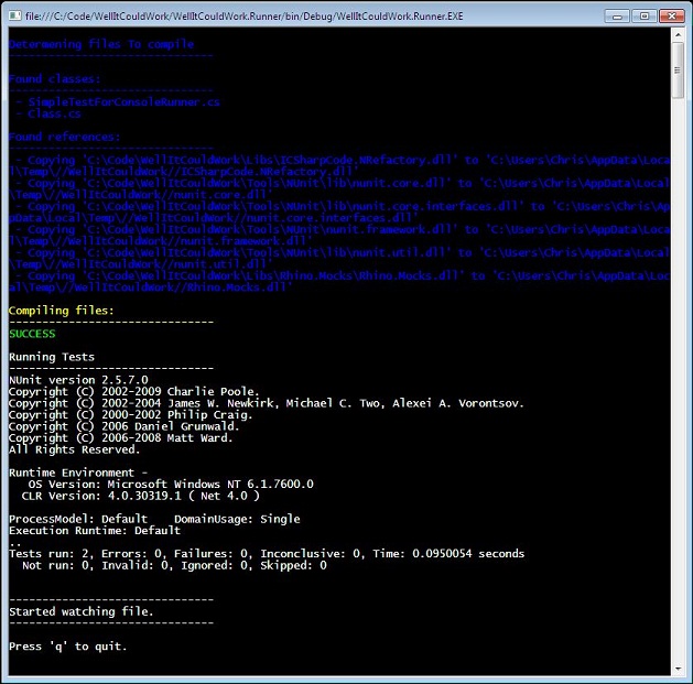 Instant testing for the .net world -- a small console app that takes the path of a test file and its corresponding solution file. Whenever the test file is saved the app parses the file to find any dependencies required referenced in the file, then builds a temporary assembly and runs the NUnit test runner against this little assembly i.e. Output