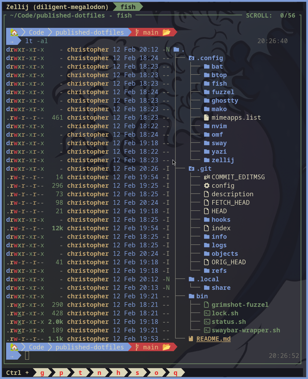 - Sway, fuzzel, Ghostty, fish, neovim, zellij, mako, Kuro