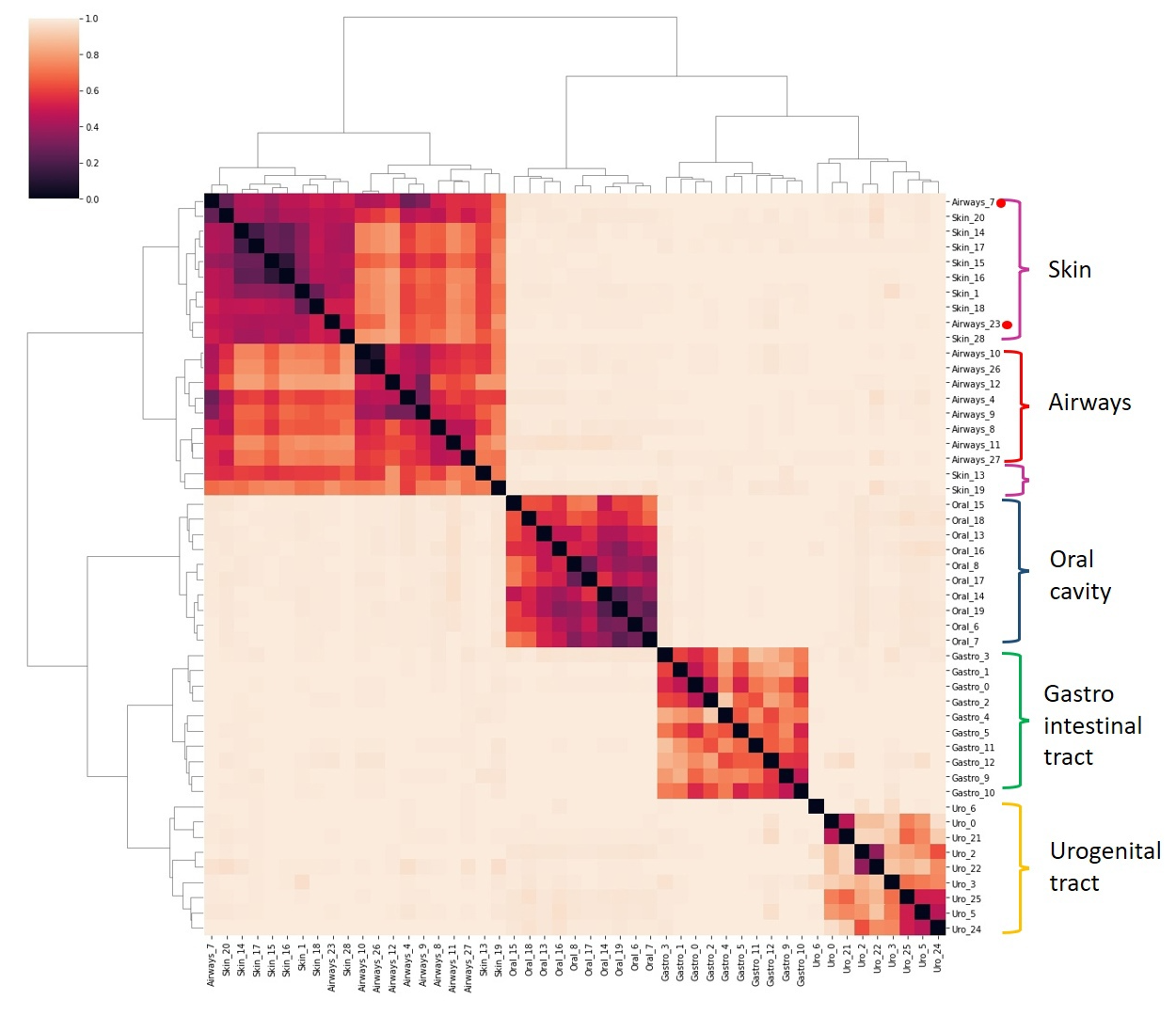 As we can see, the results of the two methods are quite similar. Both images show a clear distinction between oral cavity, gastrointestinal tract, and urogenital tract groups. In contrast, both approaches faced difficulties distinguishing between airways and skin groups, but MetaFast demonstrated a more evident differentiation.