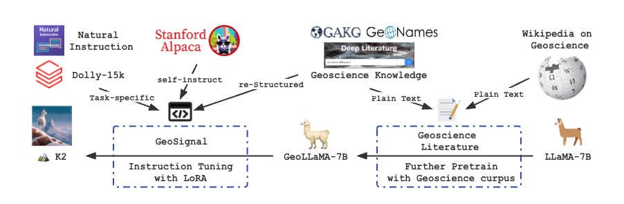 - Instruction tuning with restructured domain knowledge, which we call expertise instruction tuning. For K2, we use knowledge-intensive instruction data, GeoSignal.