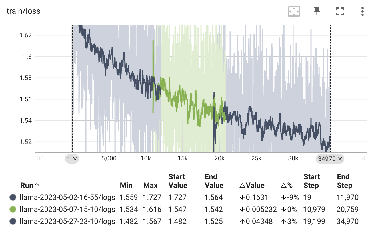 Tips: We can not resume smoothly from checkpoints for the limited computing power. Therefore, we did not load the optimizer state dict when resuming training. Even though there are two noticeable spikes in the diagram, the performance seems to stay at normal.