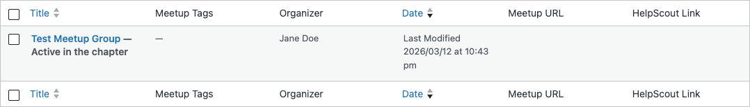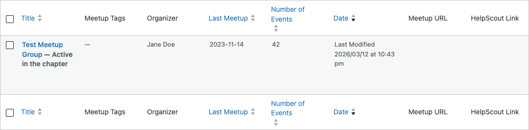 class-meetup-admin.php: Addedlast_meetupandnumber_of_eventstocolumn_headers(), addedsortable_columns()override, addedhandle_sortable_columns()forpre_get_postssorting, and added rendering incolumn_data()tests/wcpt-meetup/test-meetup-admin-columns.phpwith 8 integration tests covering column headers, sortable columns, and column data renderingTest plan