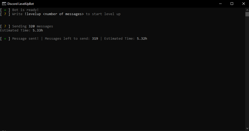 config.json!levelup <amount of messages>WARN: Using a selfbot is against TOS, It's not my fault if you get a ban when someone reports you