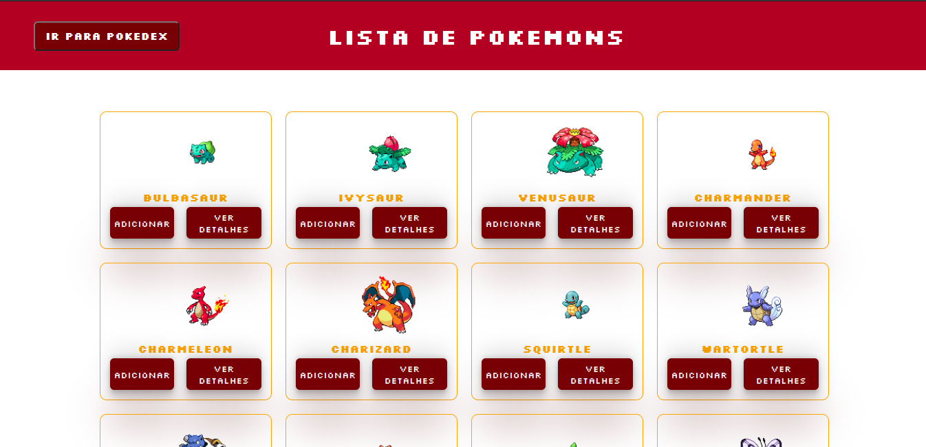 Neste projeto, desenvolvemos uma Pokedéx, em que deveríamos pegar uma lista de pokemons a partir da API PokéAPI. Dentre os requisitos do projeto, foram criadas três páginas, Home: com os pokemons alimentados pela API, onde tem a possibilidade de ver os detalhes de cada um e adicionar à pokedex. Detalhes: Apresenta imagens do pokemon, tipo, habilidades e ataques. Pokedex: Contém os pokemons inclusos na pokedex, podendo remover cada um deles.