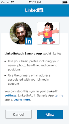 github "gabrielvincent/LinkedInAuth-Swift"A sample app is available at https://github.com/gabrielvincent/LinkedInAuth-SampleApp