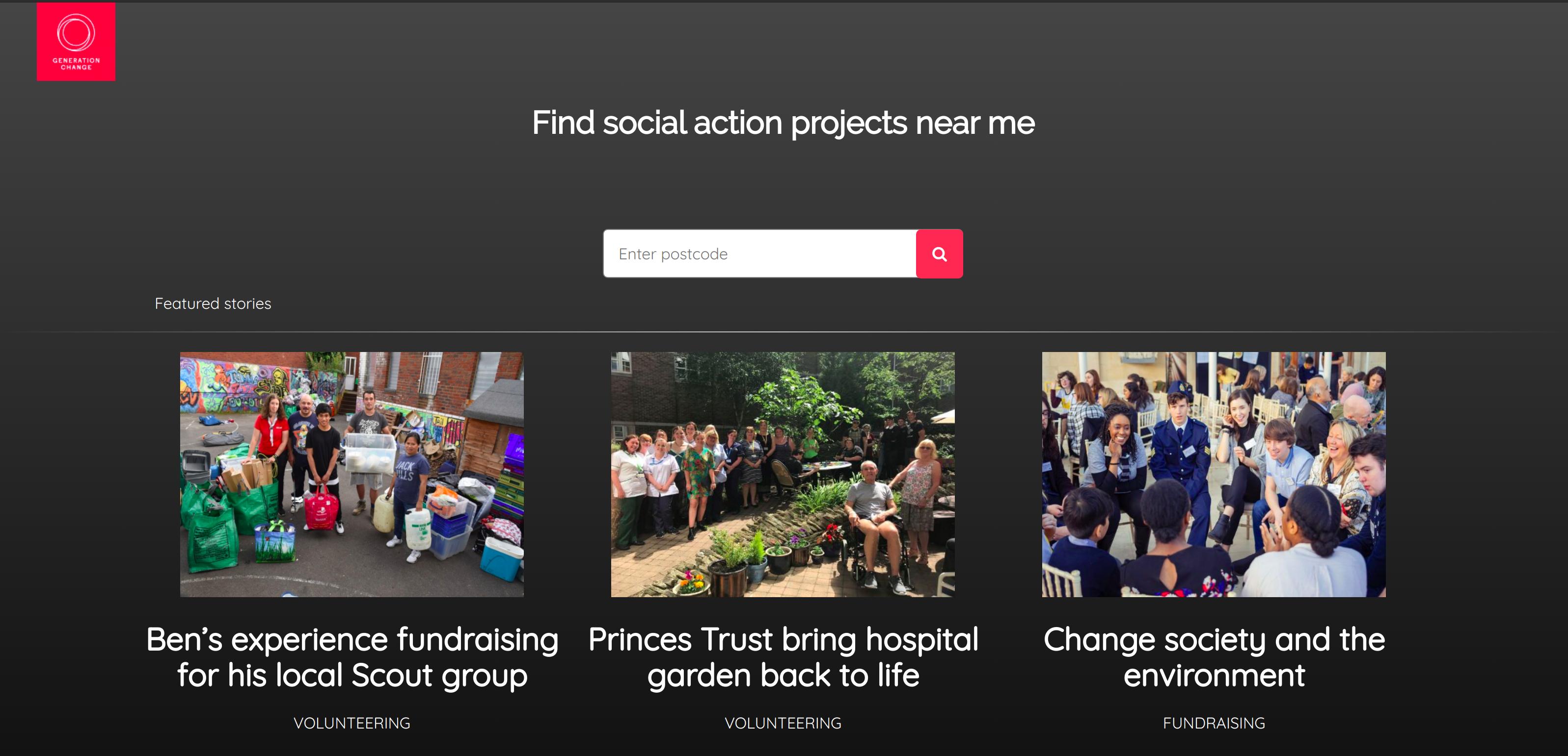 Hi 👋 Welcome to The Generation Change Project, a website that allows educators (teachers, scout leaders and anyone that works or volunteers with young adults) to find local social action projects for their young people. 👨👨👦👦