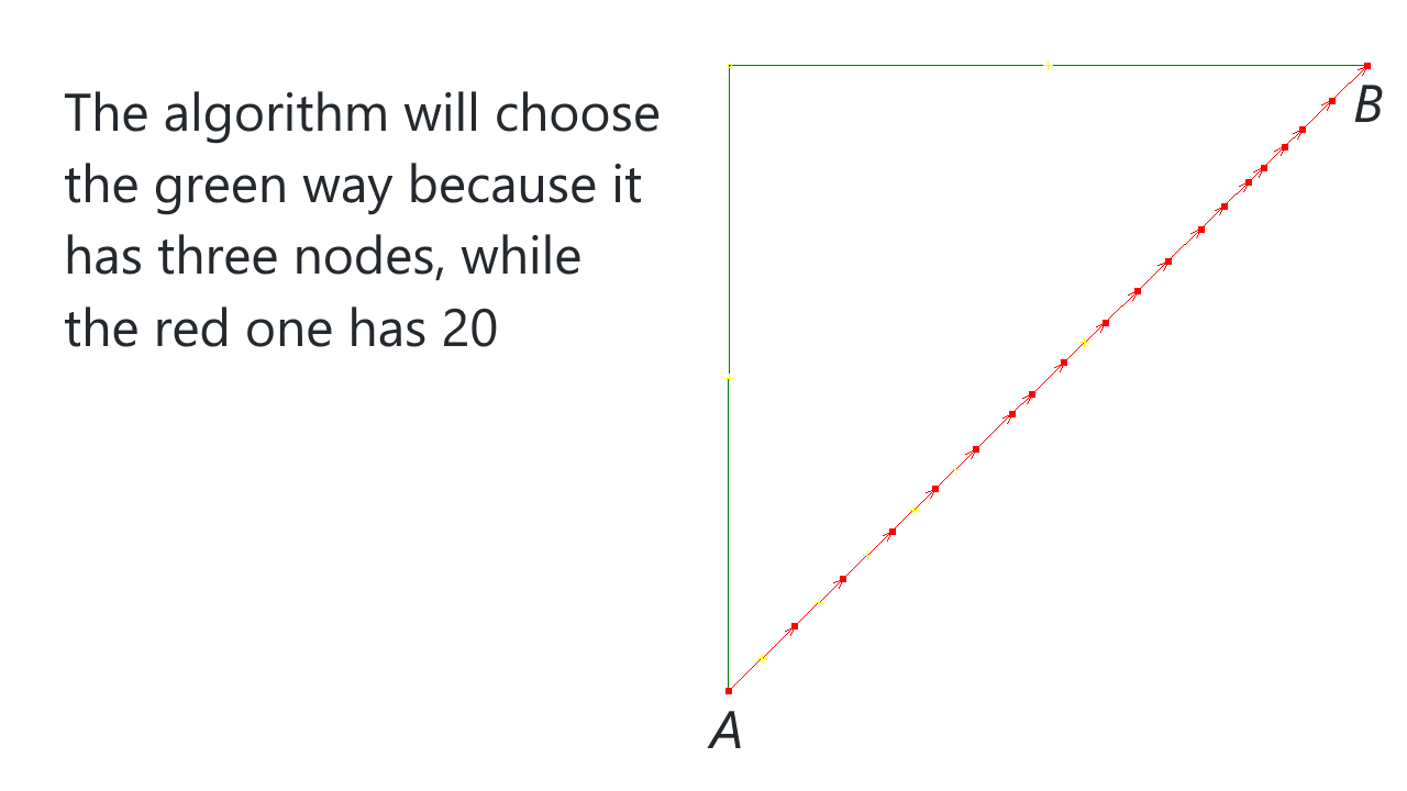 The app uses the Breadth-first search algorithm to find the path between two nodes. This path will have the least amount of nodes.