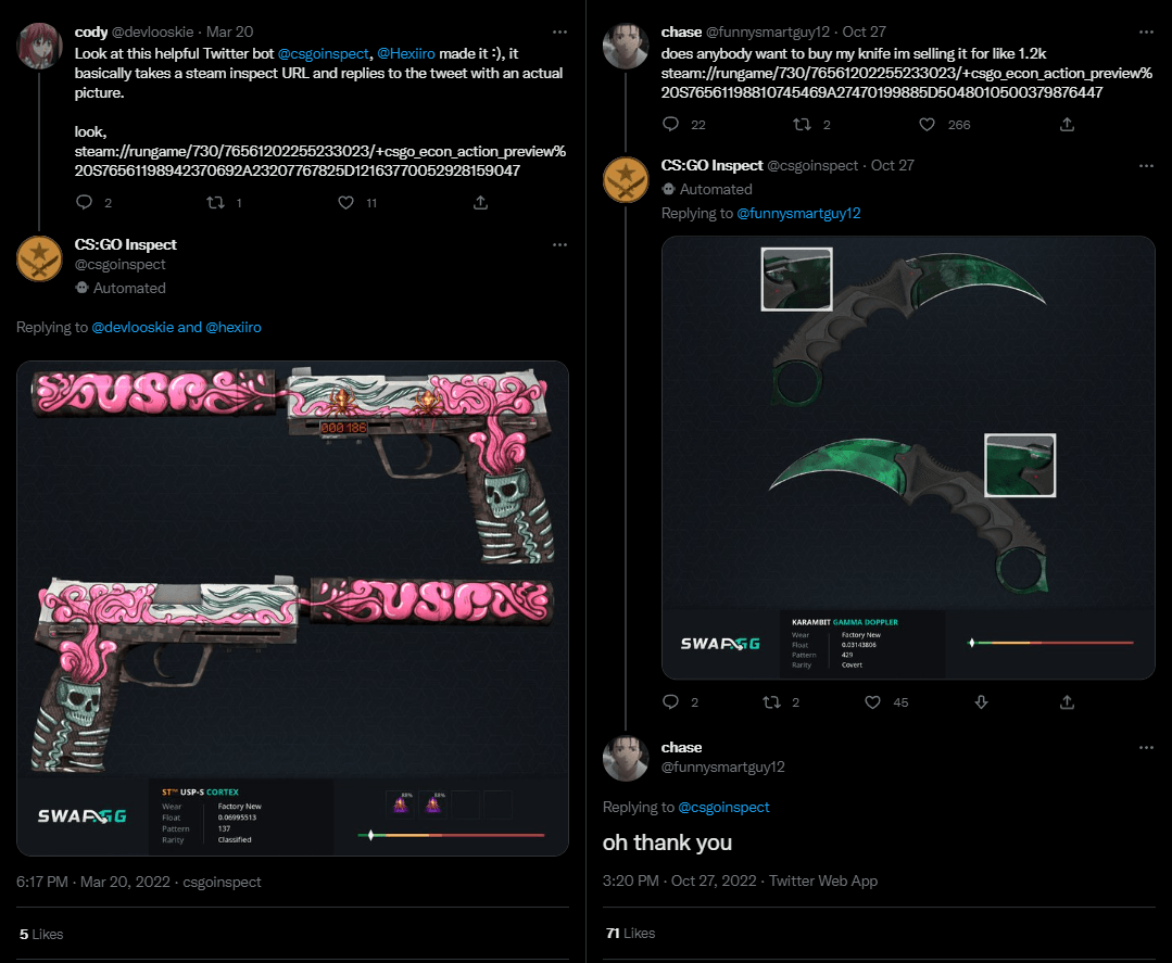 Counter-Strike Inspect a Twitter/X bot that replies to CS2 inspect links with a generated screenshot. Screenshot Tools Skinport