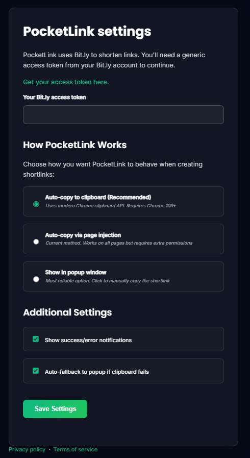 PocketLink is a lightweight and secure Chromium browser extension that creates a Bit.ly shortlink for the current page and copies it to your clipboard in a single click. It's built to be fast, unobtrusive, and feel like a native part of your browser.