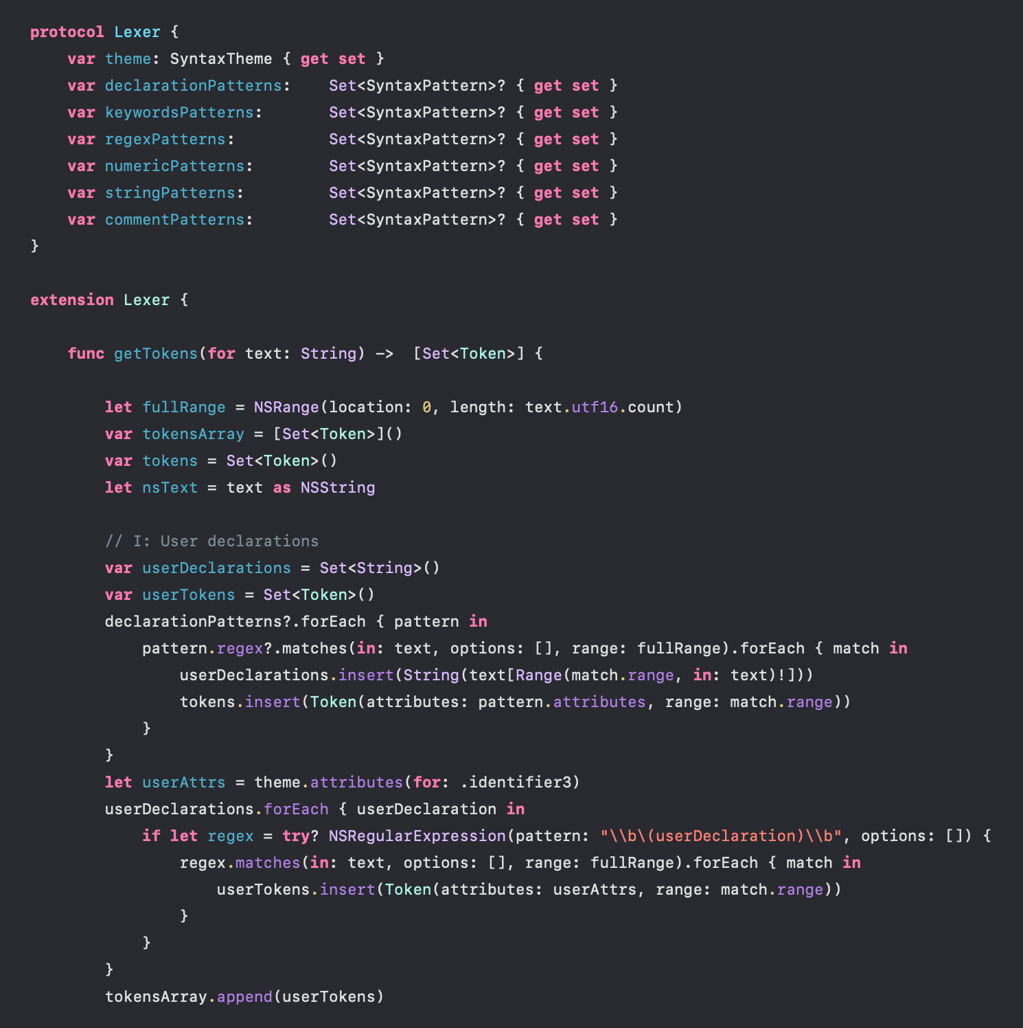 - Lexer (protocol) converts coding language keywords/regex into Syntax Patterns (struct) - a combination of patterns matching substring/regex, syntax type, and style in form of [NSAttributedString.Key], which will be used to generate matching tokens ( NSAttributedString.Key + NSRange ) for NSTextStorage to process