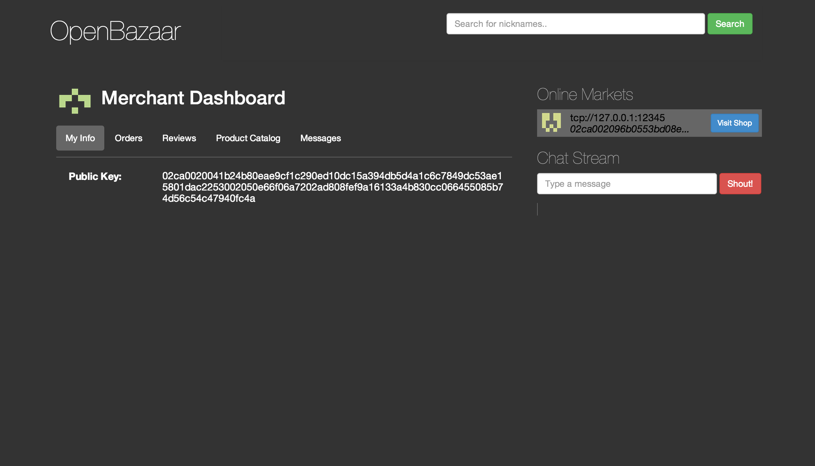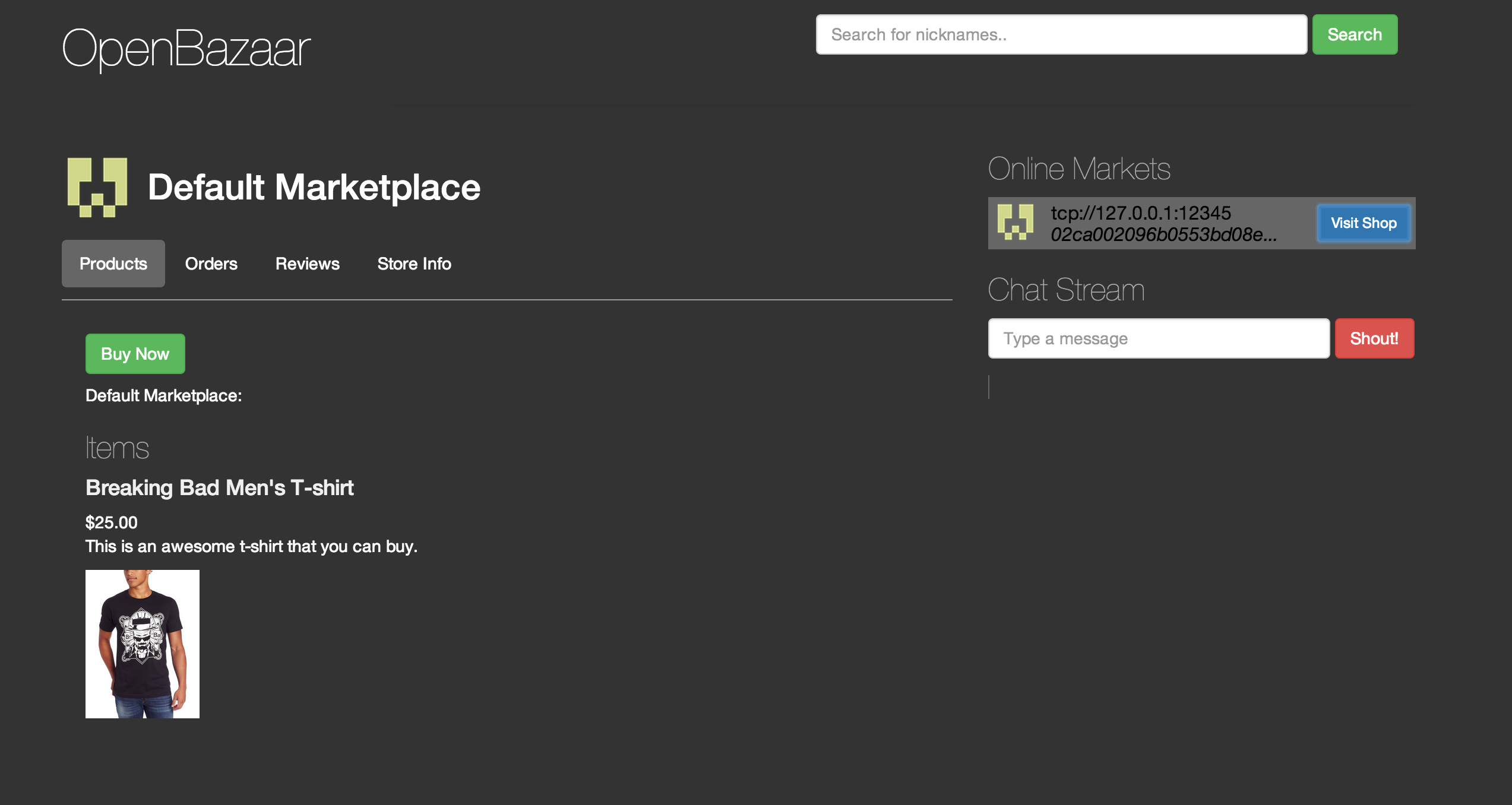 git clone https://github.com/OpenBazaar/OpenBazaar.git && cd OpenBazaarvagrant up && vagrant sshcd /vagrant && ./run_dev.sh- Open http://localhost:8888