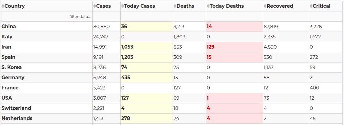 Datatable that include full country data and also highlights new cases and deaths. Filtering and sorting are enabled as provided natively from Dash. Updated constantly via NovelCOVID/API.