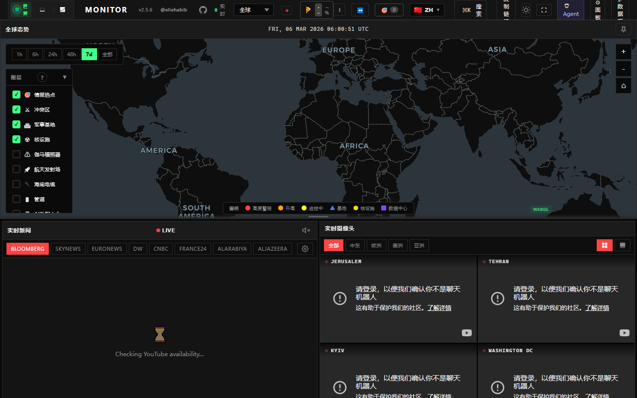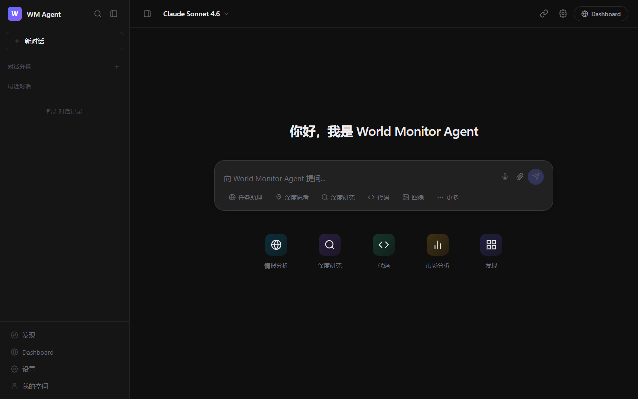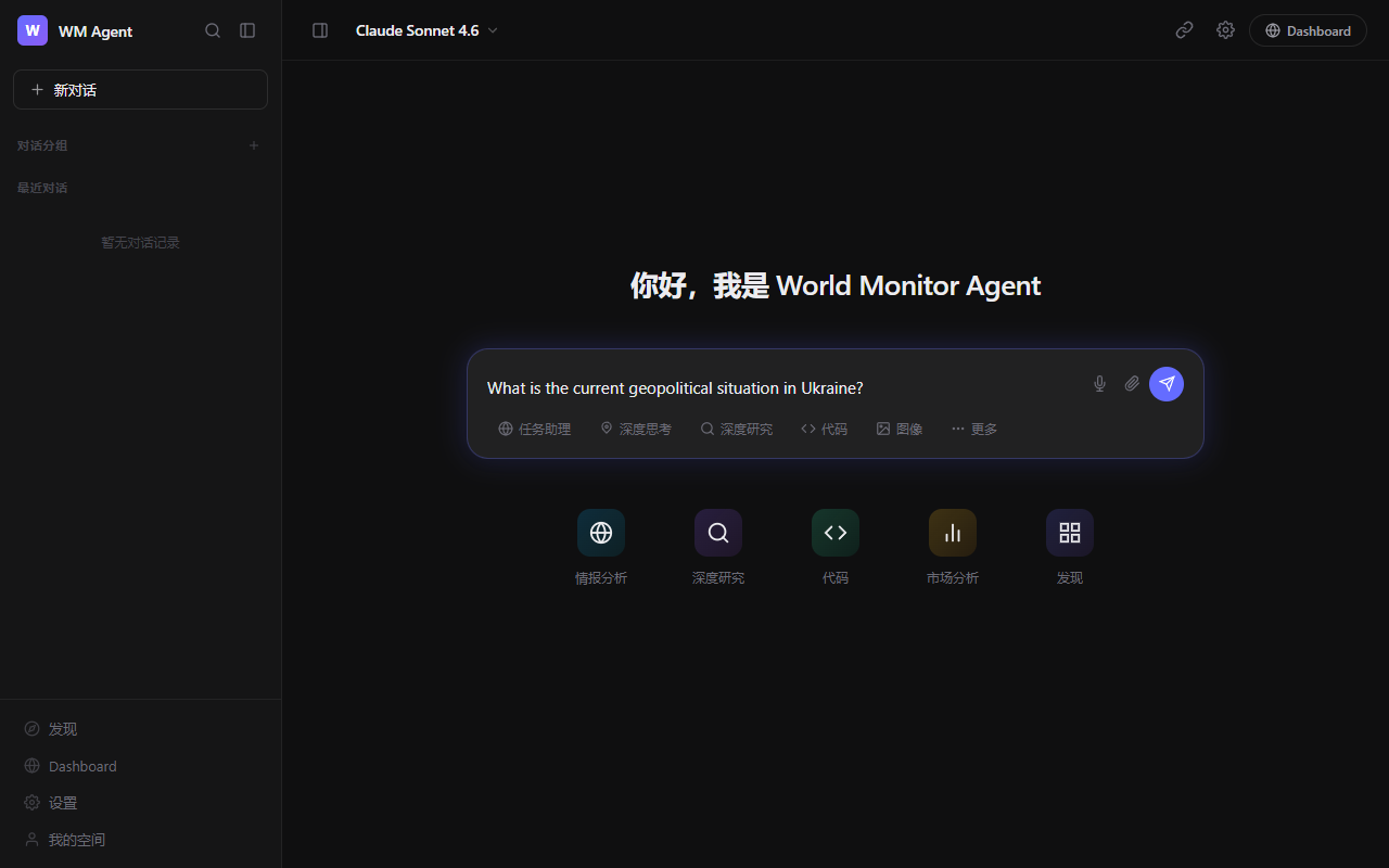 ScreenshotsMain Dashboard WorldMonitor with AI Agent button (top-right header)Agent Welcome ScreenDark theme, sidebar with conversation history, tool mode shortcuts (Intel Analysis, Deep Research, Code, Market Analysis, Discover) Agent Input Ready (query typed)Input activated with send button highlighted, tool mode chips visible below input Agent Tool Mode CardsQuick-access cards for each analysis mode with icons Live demo: accessible at /agent.html when running Real-time web search: Before each LLM reply, the agent fetches recent headlines from GDELT DOC API (no auth required, CORS: *) and injects them into the system prompt similar to Qwen/Doubao web search feature. |