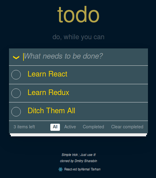 Basic To-Do App with React Hooks How-to Use It! Just Use !t. cloned from Dmitry Sharabin reduced by Mehmet Seven React-ed by Me :) App Screenshot