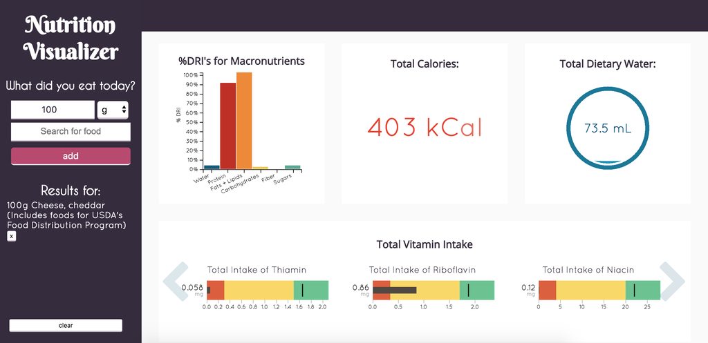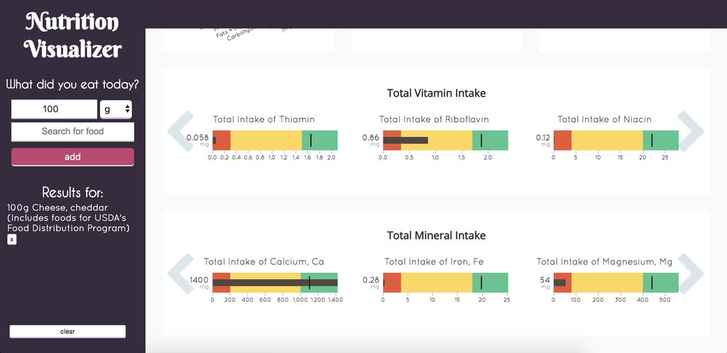 Small D3 project using data from the USDA's National Nutrient Database API to create animated data visualizations of a user's nutrient intake, based on the USDA's daily recommended intake for nutrients, vitamins, and minerals.