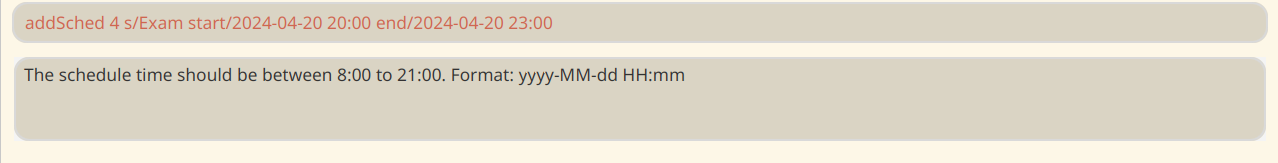 I am not able to add any event that is not within 08:00 to 21:00. However, this is not mentioned in the UG and some people may have schedule that occurs outside of this range (for eg. having scheduled calls or interviews from overseas)