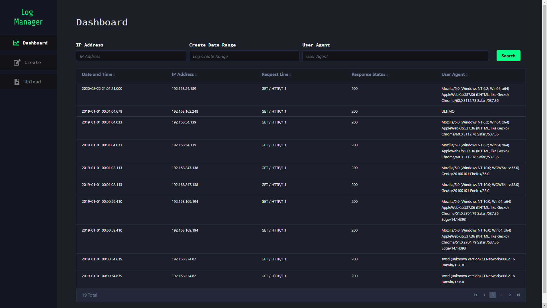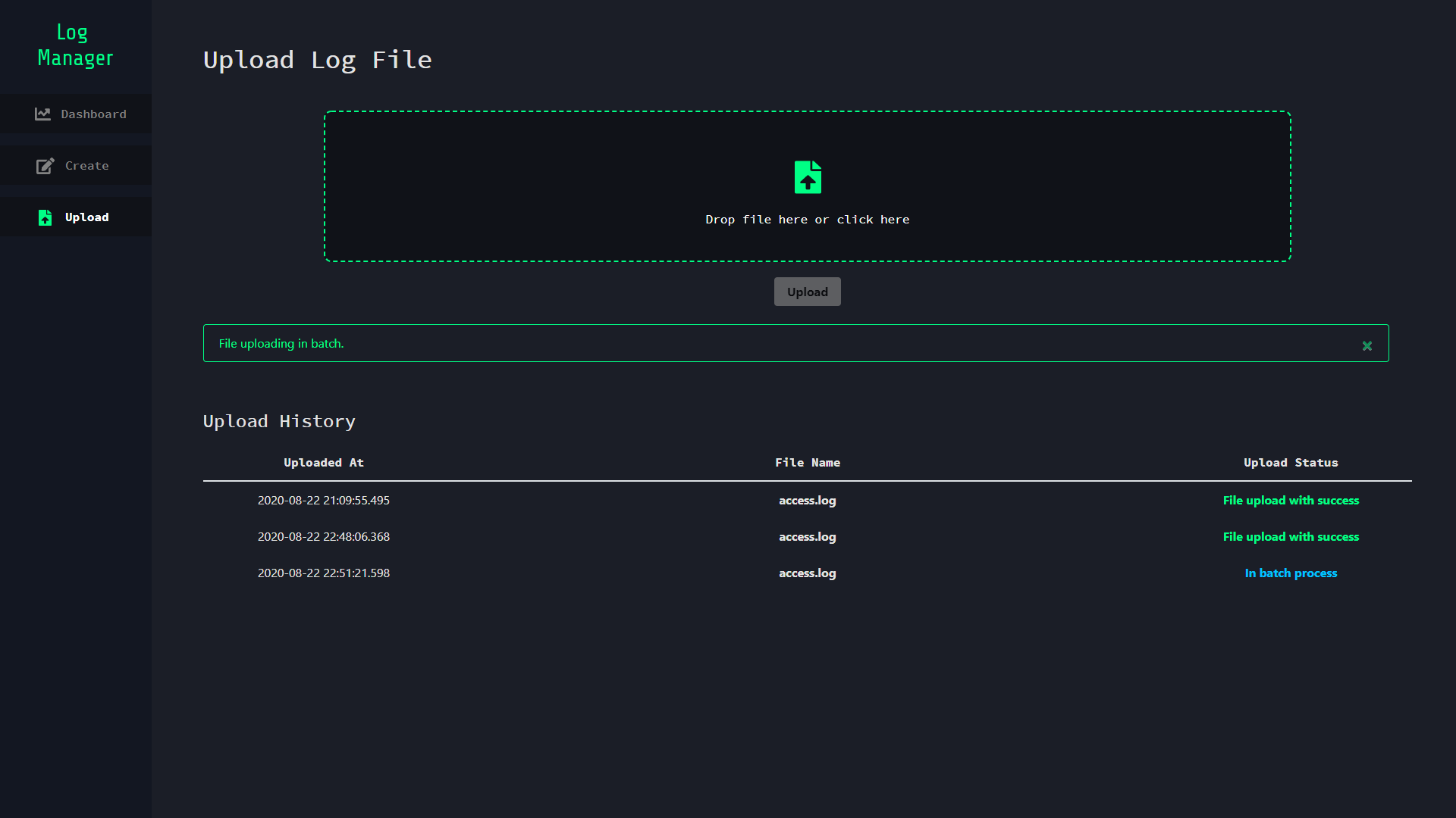 LogManager is a Web Application to management user access, with LogManager you can upload Access Log file, or insert manually. 1 - Dashboard In the dashboard panel, you can view all the logs, with pagination and the possibility of filtering.Click on the image to expand 2 - Creating User Log Manually In the creation session, you can create user logs manually.Click on the image to expand 3 - Uploading Access Log File In the upload session, you can upload files with user logs and the backend will process in batch. (Asynchronous upload)You can see the upload history with status. Click on the image to expand |