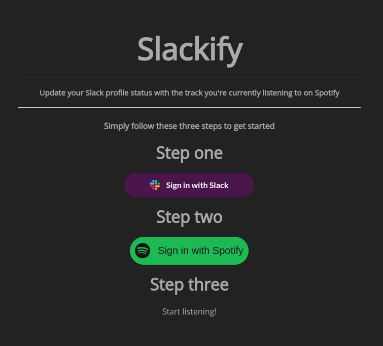Slackify is a collection of web and backend microsservices (overengineerd yet i know) used to query Spotify and get your currently listening to track and update your status within Slack.