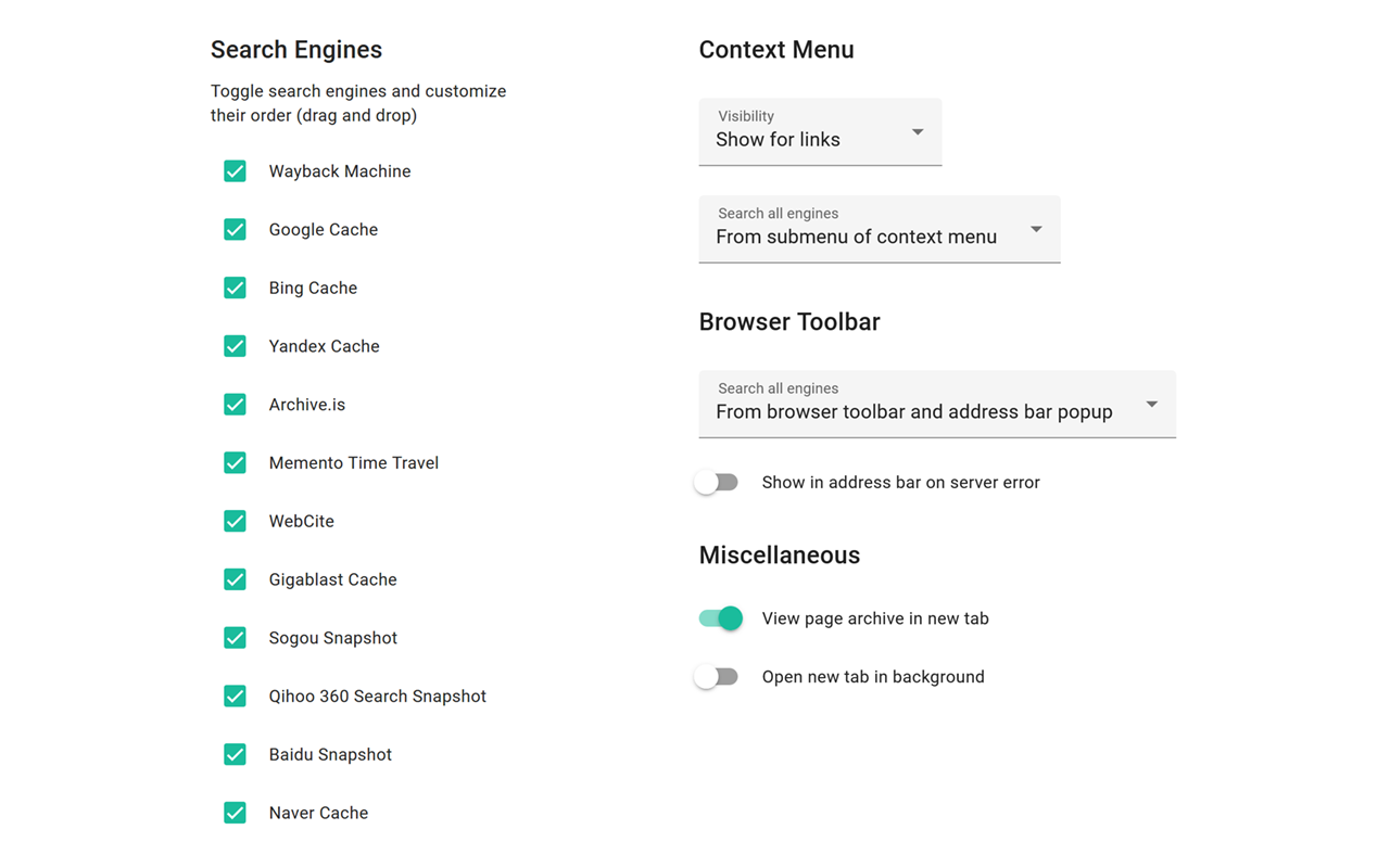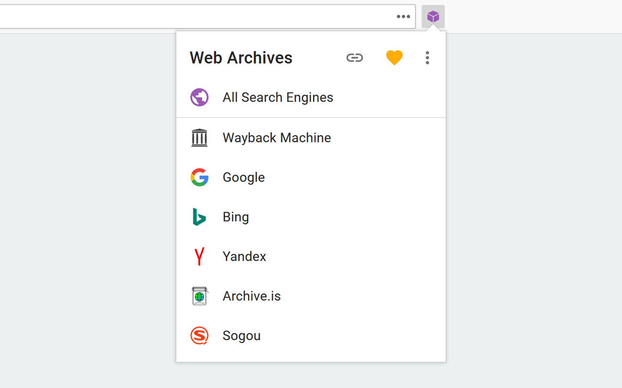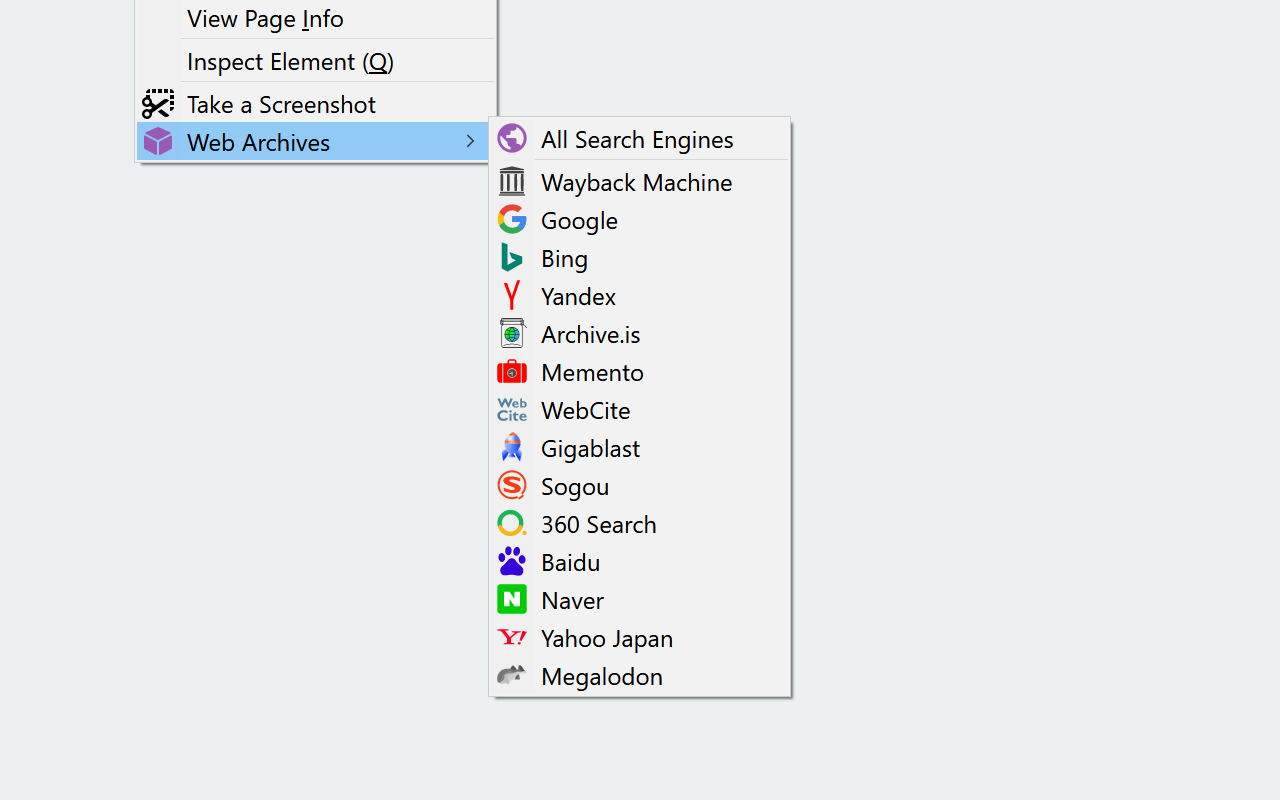 Web Archives is a browser extension which helps you to find archived and cached versions of web pages. Searches can be initiated from the right-click context menu, the browser toolbar, or the address bar in case of a server error.