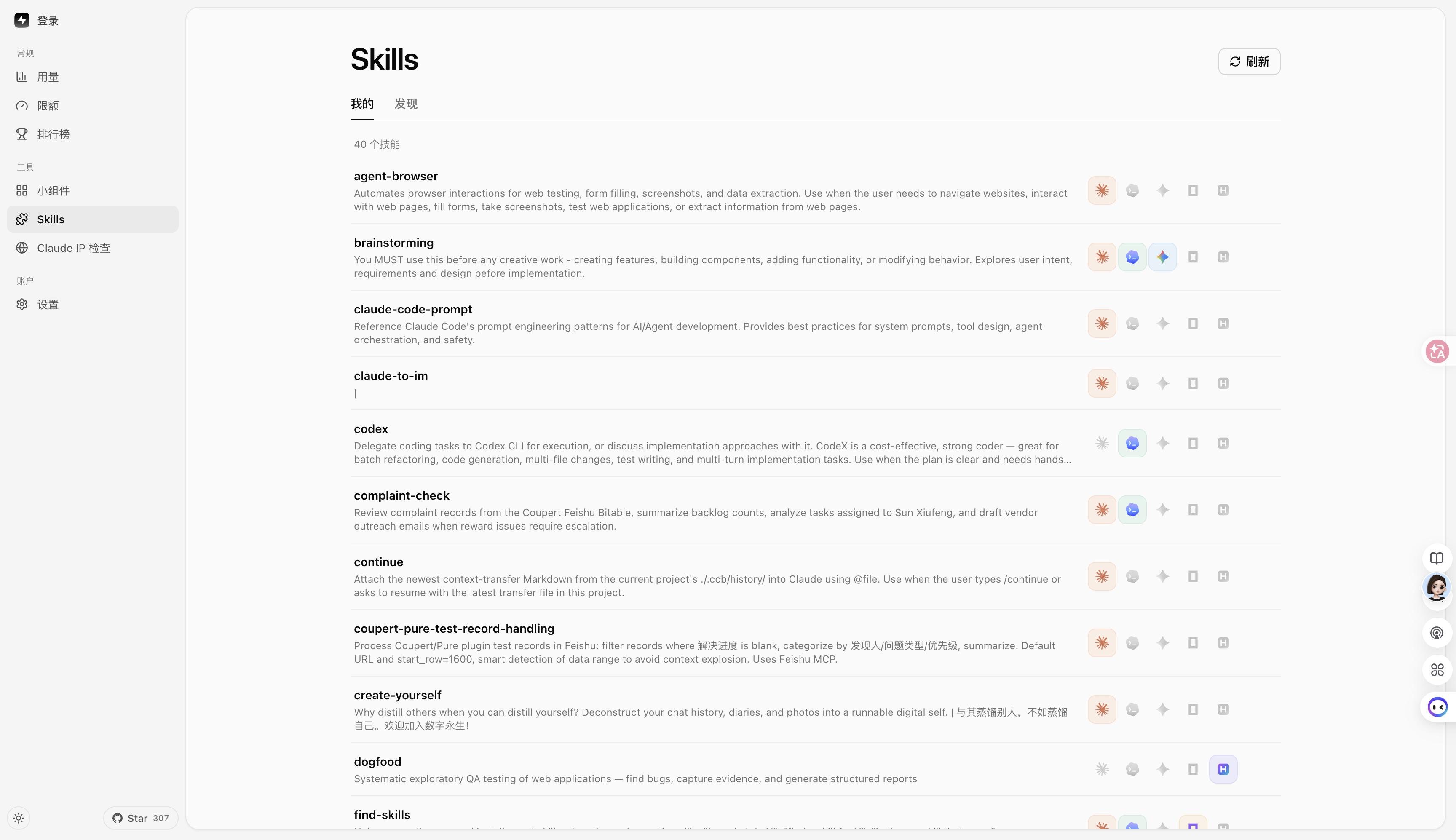 • 🧩 Skills manager — browse 250+ public skills from anthropics/skills, ComposioHQ/awesome-claude-skills, skills.sh and any GitHub repo you add; install once and sync to Claude / Codex / Gemini / OpenCode / Hermes with per-target toggles; one-click Undo