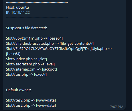 0 3 * * * /path/to/scann.sh /var/www/htmlWhen the script detects a suspicious file, it sends a notification to the specified Telegram chat.