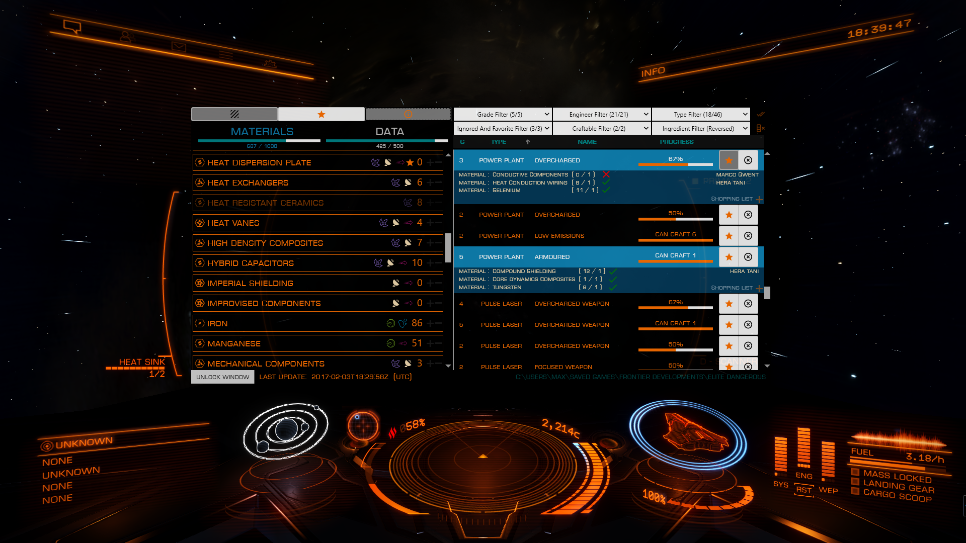 EDEngineer is a basic app I've written to track materials, data and cargo acquired in Elite Dangerous. That way, we can also track progress of blueprints available from the Engineers. Installer here.