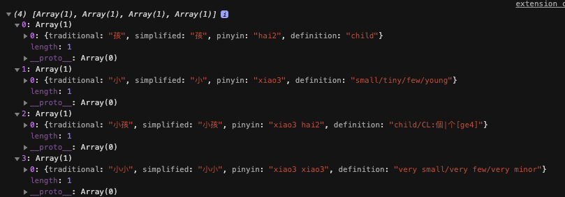 console.log(hanzi.dictionarySearch('小孩', 'exact'))gives