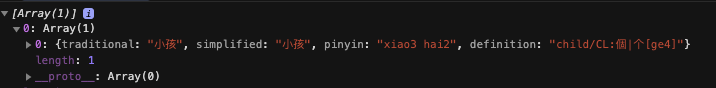 console.log(hanzi.dictionarySearch('小孩', 'only'))gaveconsole.log(hanzi.dictionarySearch('小孩'))gaveBut now this
