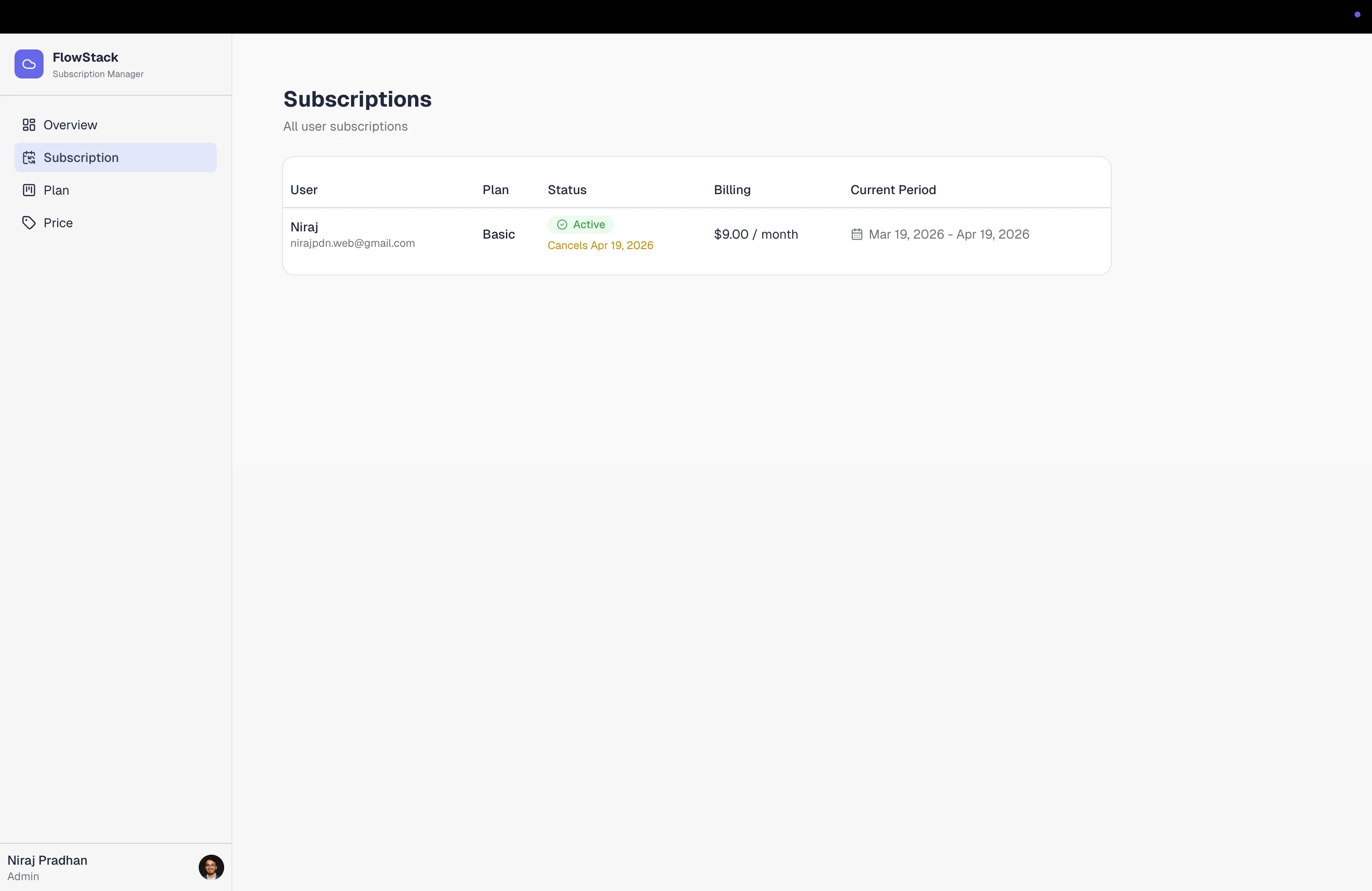 View all user subscriptions across the platform — plan, status, billing amount, current period, and scheduled cancellations.