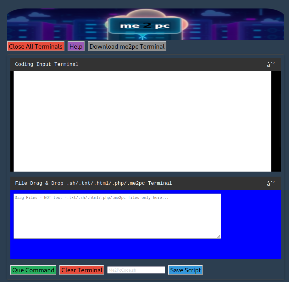 me2pc html Browser Coding Terminal with Drag and Drop Input - MIT Licensed. Must give Author Credit. Copywrited Protected Schema.