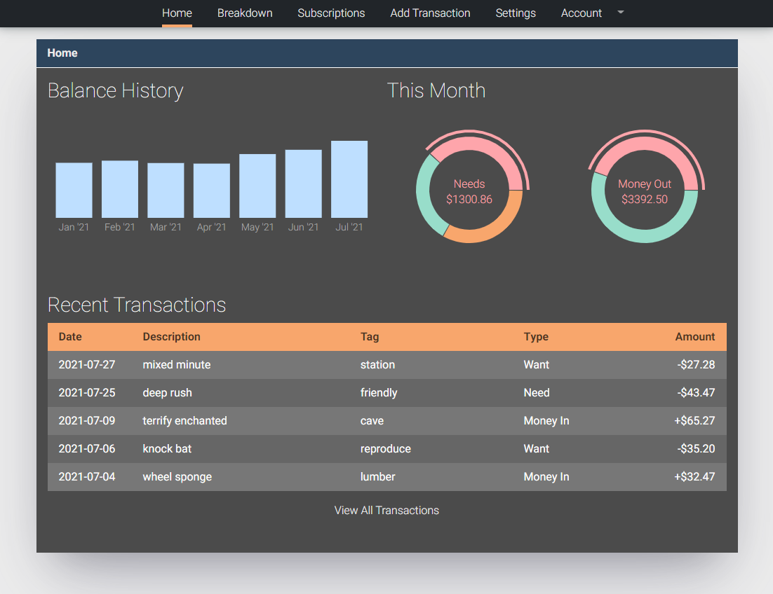 This app was made using Create React App, with Firebase by Google for data storage and authentication. The primary language is JavaScript. We used React Router DOM for navigation and Recharts for rendering the graphics on the dashboard. We have also used React Bootstrap for styling.