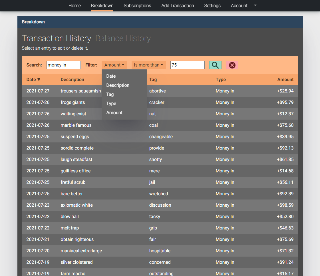 Use the Breakdown page for a more detailed and in-depth view of the individual transactions, with the ability to search sort and filter transactions
