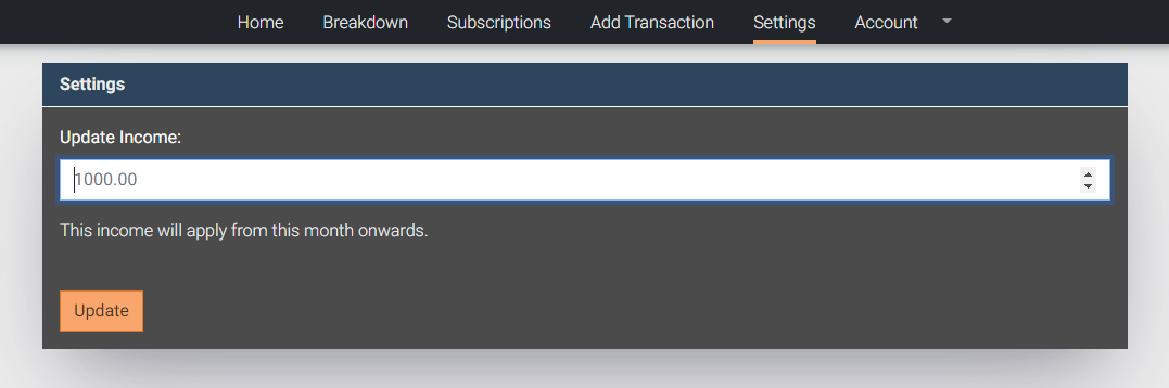 There will be a prompt to enter the current balance, the monthly income and the earliest transaction date for the user. (Take note that the date entered will be the earliest date that the user intends to add a transaction.)