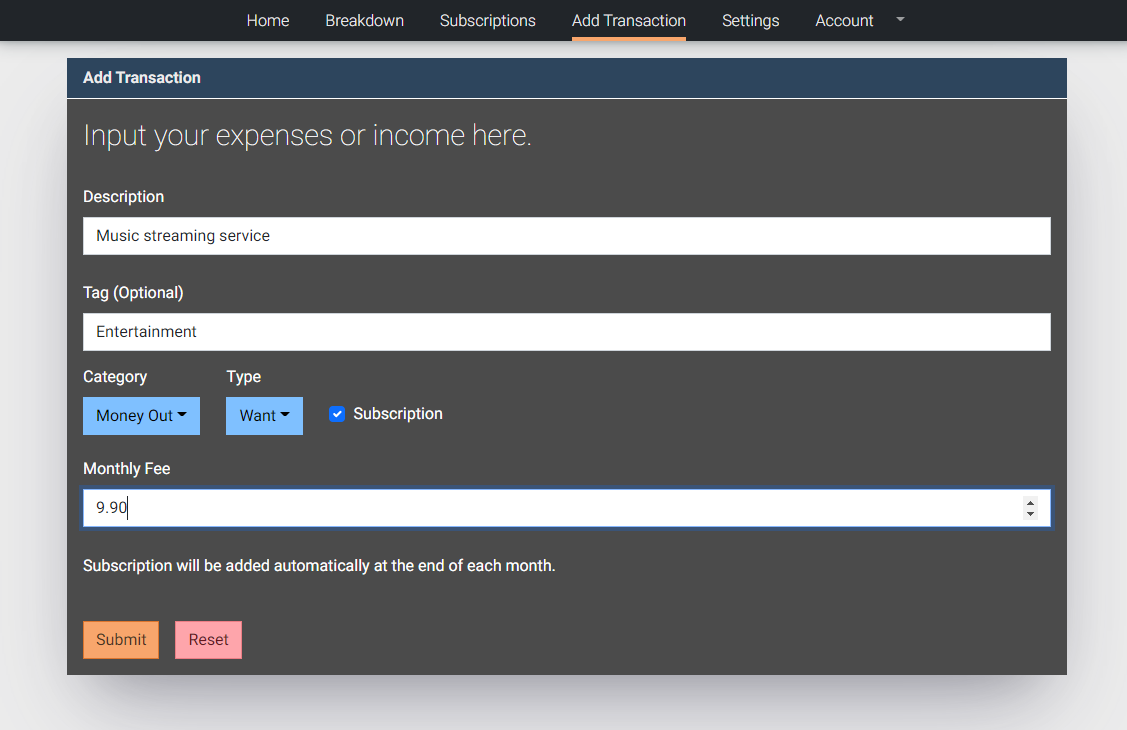 Create, update and delete transactions or add recurring transactions as a monthly subscription