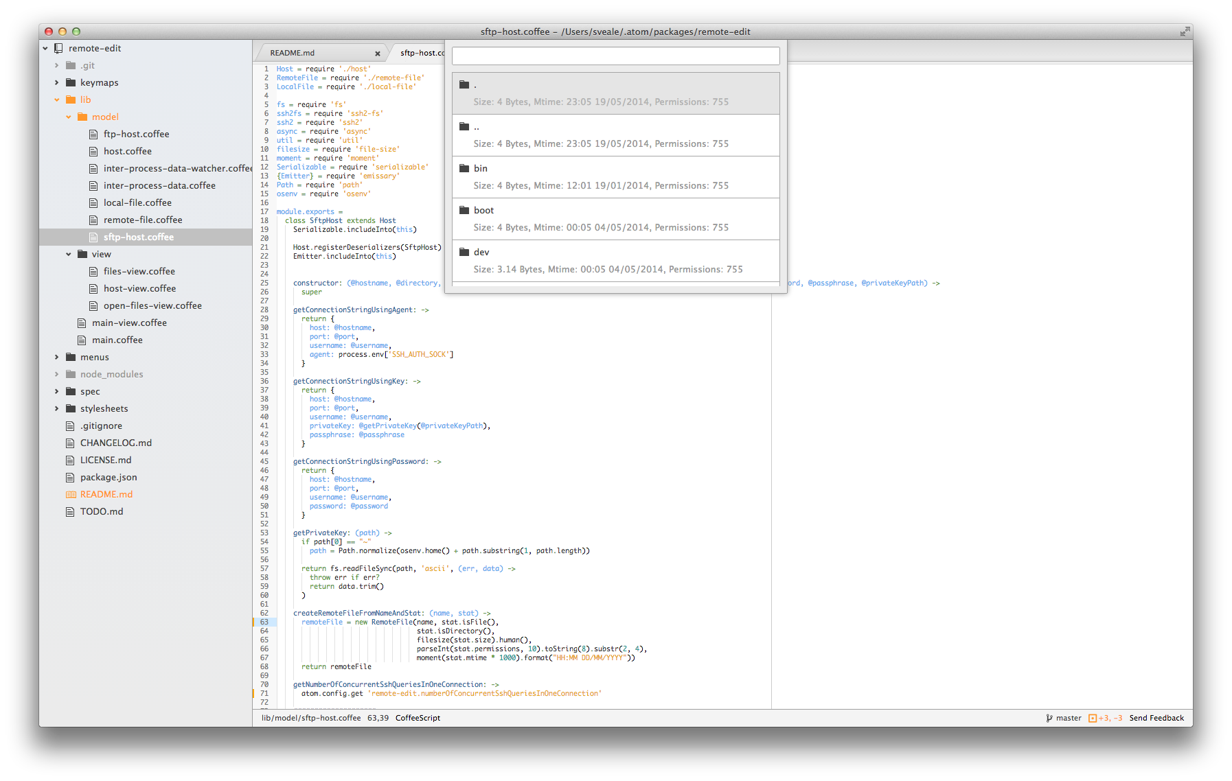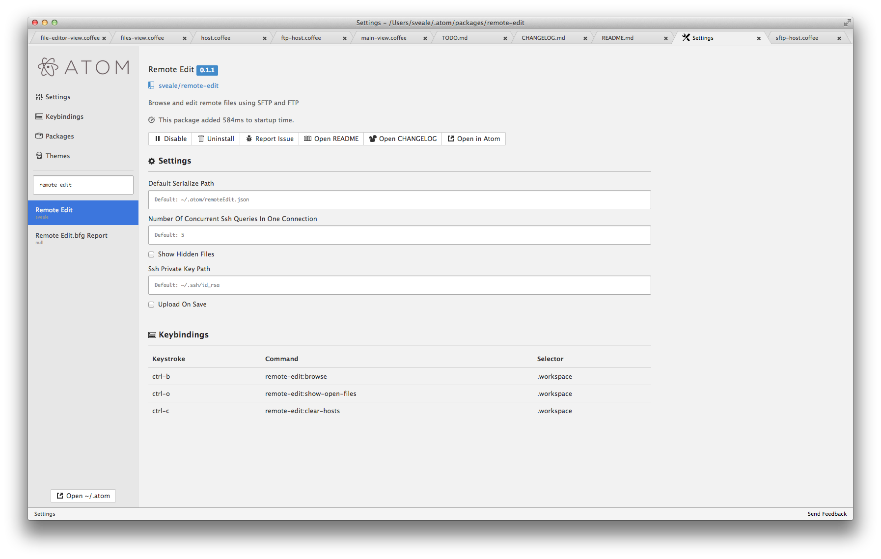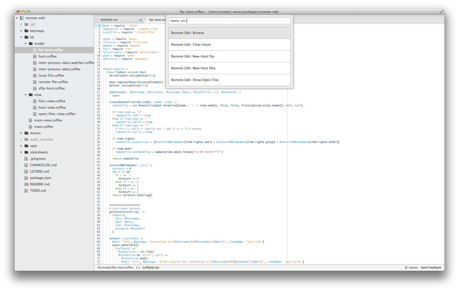 remote-edit for atom.io Atom package to browse and edit remote files using FTP and SFTP. Features See changelog Settings Usage Commands Add a new host Browse hosts Browse files Open files