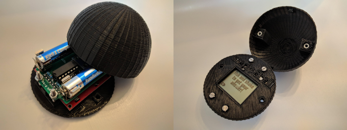 Dialectic Ball is comprised of an ATtiny84, connected to a GY-61 module (based on the ADXL335 accelerometer) and an LCD screen like the ones used on the old NOKIA phones! Two AAA batteries are powering the gadget up and a 3D printed case encompasses everything, giving it a hemispherical shape. The PCB that routes everything together was manufactured by JLCPCB, who will make your prototype PCB's for just 2$ and were kind enough to sponsor the rev. 0 boards.