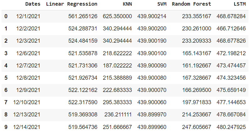 It is a big challenge to predict how the stock market performs given various factors like people sentiments, fundamentals of the company etc. The stock prices of all the listed companies fluctuate everyday and it is very helpful if we can get an insight on how the stock has performed over the past years and predict the future price of the stock. In this project, the aim is to leverage 5 different machine learning models to compare the results of these models and choose the model with best results to predict future price of the stock. The results of the experiment show that LSTM model has the potential to predict the future price of the stock most accurately
