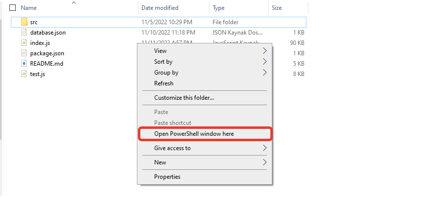 Then we open the PowerShell terminal by "shift + right click" on the folder of the file you created.