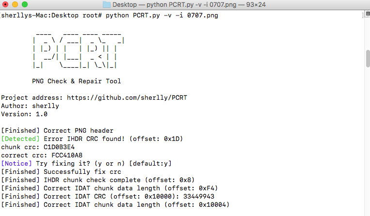 PCRT (PNG Check & Repair Tool) is a tool to help check if PNG image correct and try to auto fix the error. It's cross-platform, which can run on Windows, Linux and Mac OS.