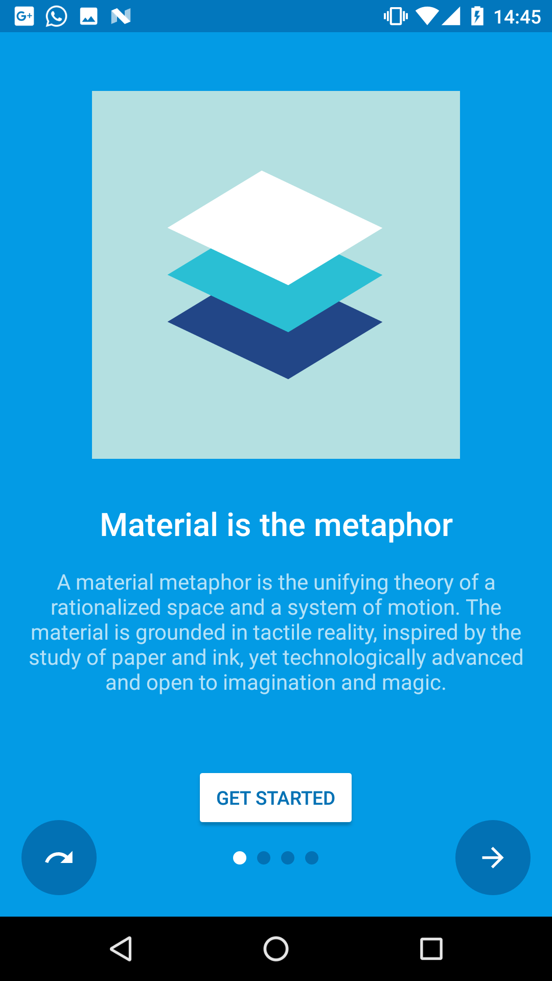material-intro has fluent style builders for both a simple text/image slide, as seen in Google's apps, and for slides featuring a custom Fragment or layout resource.
