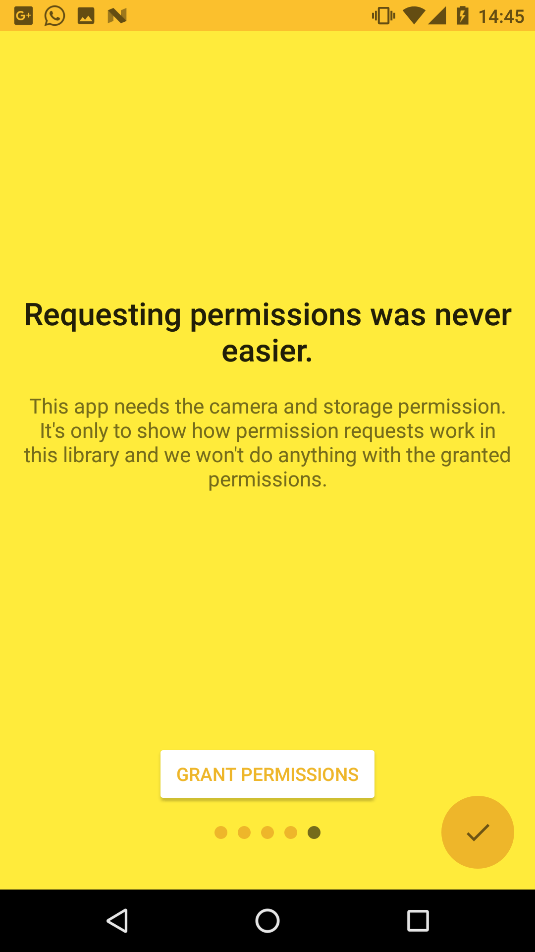 SimpleSlideby settingSimpleSlide.Builder#canGoForward(boolean)/SimpleSlide.Builder#canGoBackward(boolean). (If at least one permission is set to theSimpleSlide, navigation is automatically blocked until every permission is granted.) - From your
